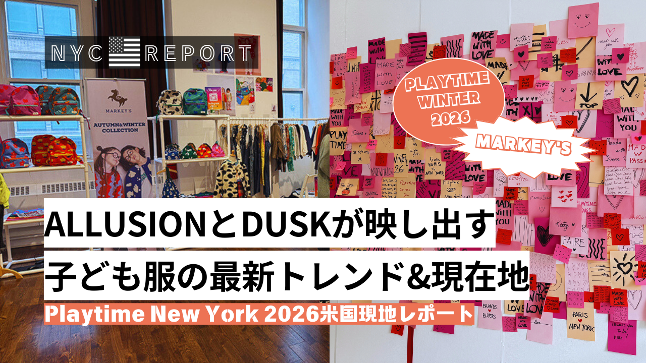 2026年2月8日~10日に米国ニューヨークで開催された「Playtime New York」より、ベビー&キッズファッション最新トレンドを現地取材。2026-27年秋冬トレンドテーマ「ALLUSION(アリュージョン)」「DUSK(ダスク)」の解説と、日本発キッズブランド「MARKEY’S(マーキーズ)」初出展の模様をお届けし、次世代キッズ市場の方向性を読み解いていきます。